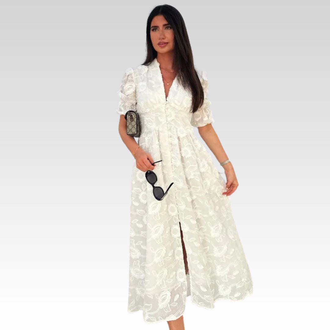 Das Dorothea Mykonos Kleid kombiniert raffinierte Eleganz mit sommerlicher Leichtigkeit. Inspiriert vom luxuriösen Stil der griechischen Inseln, überzeugt es mit einer schmeichelnden Silhouette und hochwertigem, luftigem Stoff. Perfekt für besondere Anlässe oder entspannte Abende mit Stil.